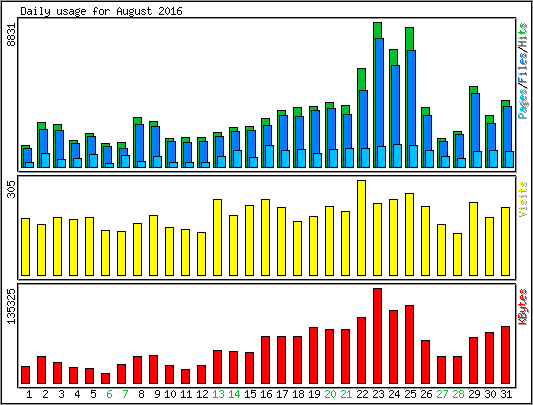 | Day | Hits | Files | Pages | Visits | KBytes |