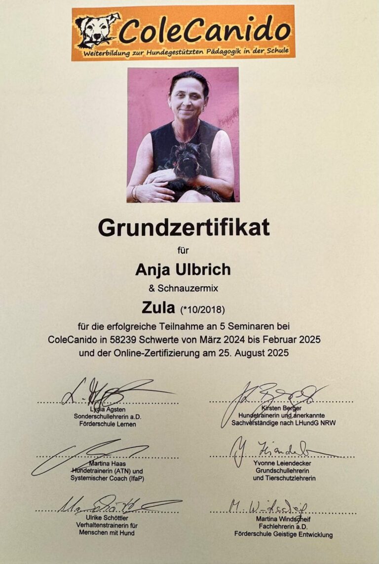 Nach erfolgreicher Zertifizierung des Teams bei ColeCanido ist Zula nun im Bereich der Hundegestützen Pädagogik in Schulen (Hupäsch) als Schulbegleithund an der HLR tätig.